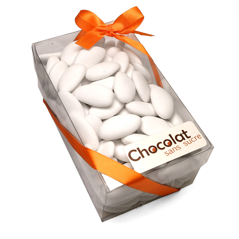Coffret offrant de fines dragées sans sucre ajouté à l'amande avola. Le sucre est remplacé par du maltitol, un édulcorant naturel.