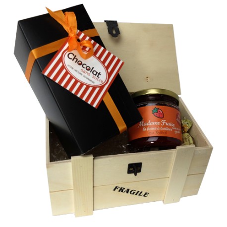 Un grand coffret en bois garni d'un ballotin de chocolats sans sucre ajouté (maltitol) et d'une pâte à tartiner à la noisette également sans sucre ajouté (xylitol) ou d'une tartinade à la fraise.