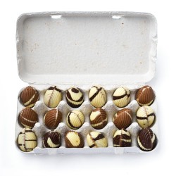 Le coffret contient 18 oeufs. Vous pouvez choisir le type de chocolat des oeufs: chocolat noir, chocolat au lait, chocolat blanc ou un mélange.