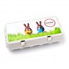 La boîte Lapinou est un beau coffret à offrir pour Pâques avec des oeufs en chocolat sans sucre ajouté. Sur la boîte se trouve une image de deux lapins déguisés dans un jardin.